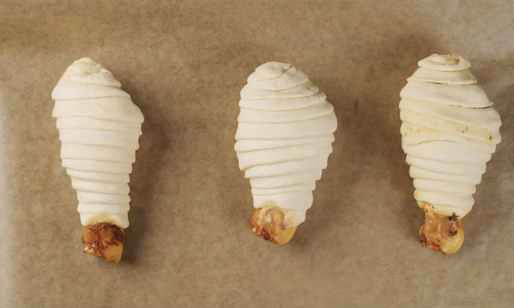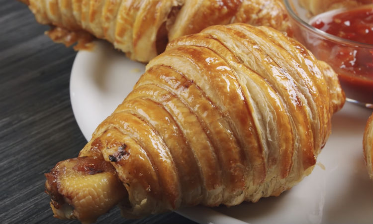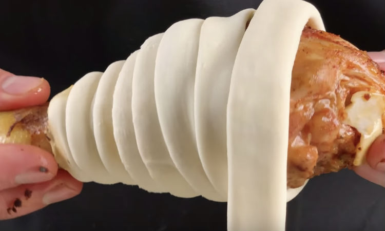 Теперь раскатываем тесто, режем его на полоски и оборачиваем ими каждую ножку. Смазываем яичным желтком, запекаем 30 минут при 200 градусах.