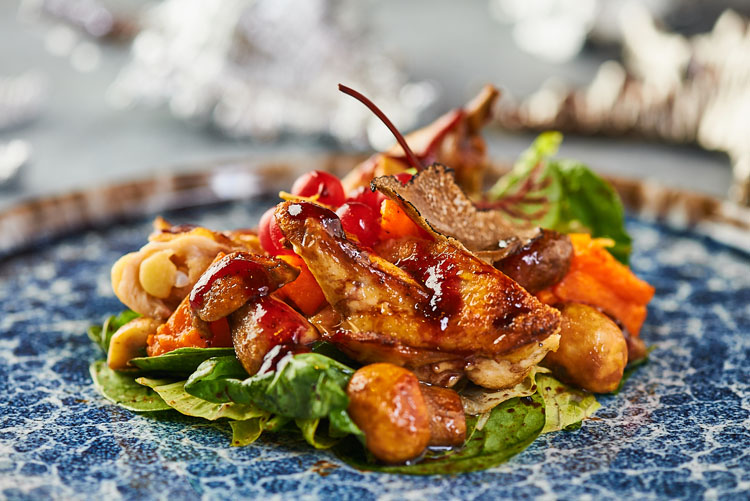 Теплый салат может быть одновременно и закуской, и вторым блюдом. В нем обычно есть мясо, овощи – полноценная замена блюду с гарниром. Мы будем готовить его из сезонных продуктов – грибы, тыква и другие овощи. А в качестве мяса мы используем птицу – повар взял цесарку, но ее легко можно заменить уткой или курицей.