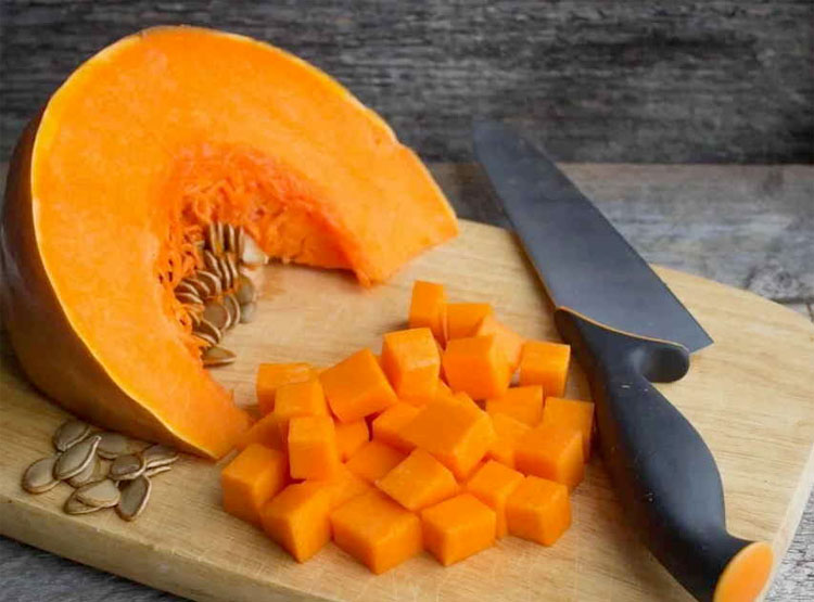 1. Тыкву очищаем от кожи и семечек, нарезаем ромбиком, затем обжариваем на сковороде, смешав оливковое и сливочное масло.