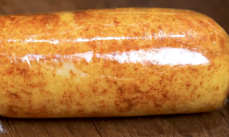 После этого выкладываем уже почти готовый сыр на пищевую пленку, ее тоже по желанию присыпем специями. Скручиваем, ставим в холодильник на три часа и можно пробовать.