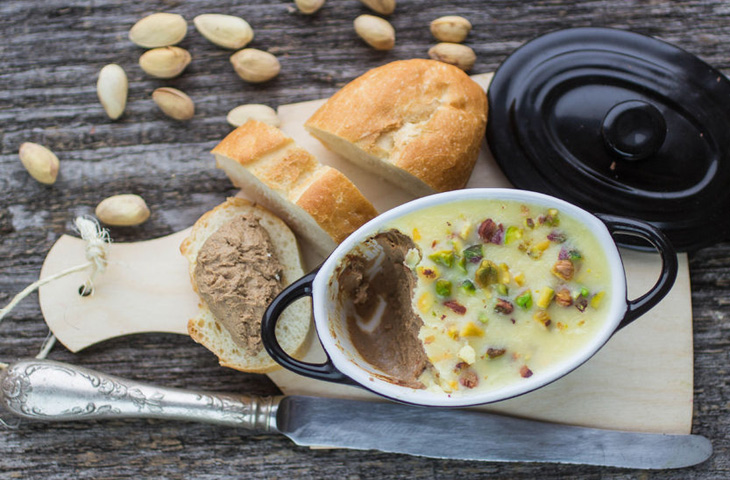 Полить паштет в каждой миске 1 столовой ложкой растопленного масла, затем дополнить нарезанными фисташками и охладить в течение 20 минут.