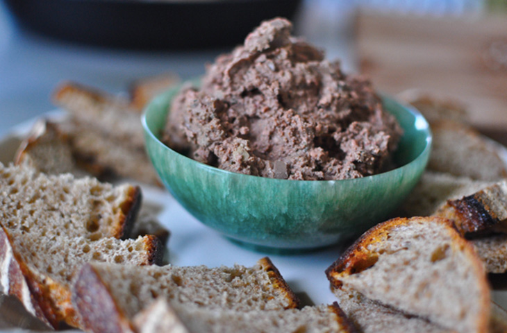 Удалить веточки трав, содержимое сковороды переложить в кухонный комбайн; дать немного остыть. Смесь пюрировать, приправить солью и перцем. Выложить ломтики багета на большой противень, выпекать приблизительно 15 минут до хрустящей корочки. Намазать паштет на ломтики багета и подавать.
