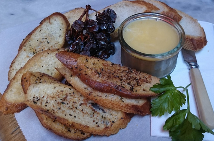 Хлеб разогреть, натереть чесноком и выложить на него печень. Подавать с луковым джемом.