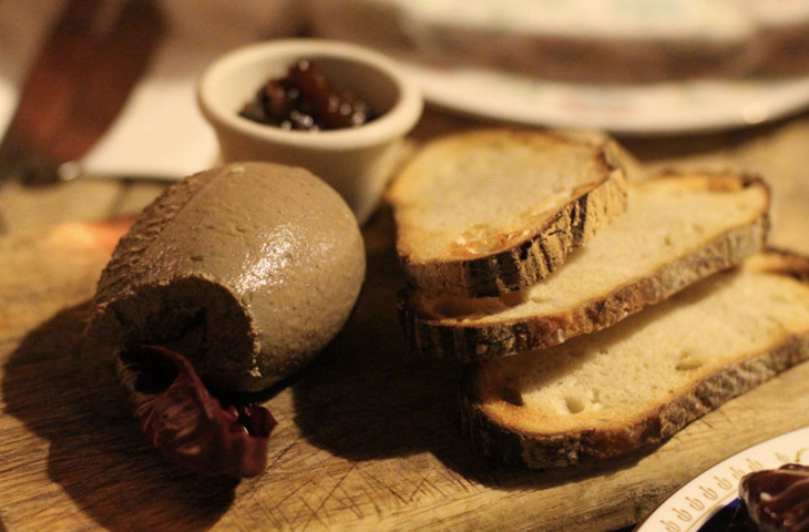 Выложить паштет в террин, установленный на противне. Поставить его в духовку и долить в противень горячей воды, чтобы она наполовину закрывала террин. Выпекать 35-40 минут, пока паштет не подрумянится сверху и не станет твердым. Террин слегка остудить и поставить в холодильник по крайней мере на 6 часов.