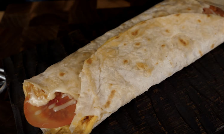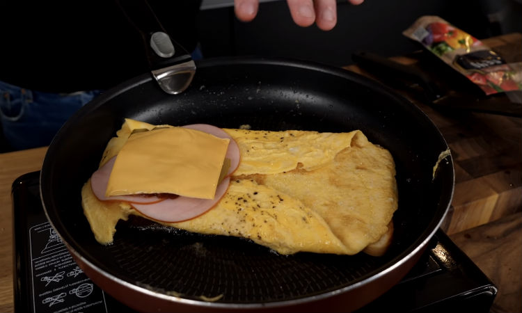 Для первого нам понадобится пара яиц, лаваш, сыр, колбаса и помидор. Яйца взбиваем и сразу на сковороду. Сверху кладем тонкий лаваш и туда же добавим сыра и все остальные ингредиенты.