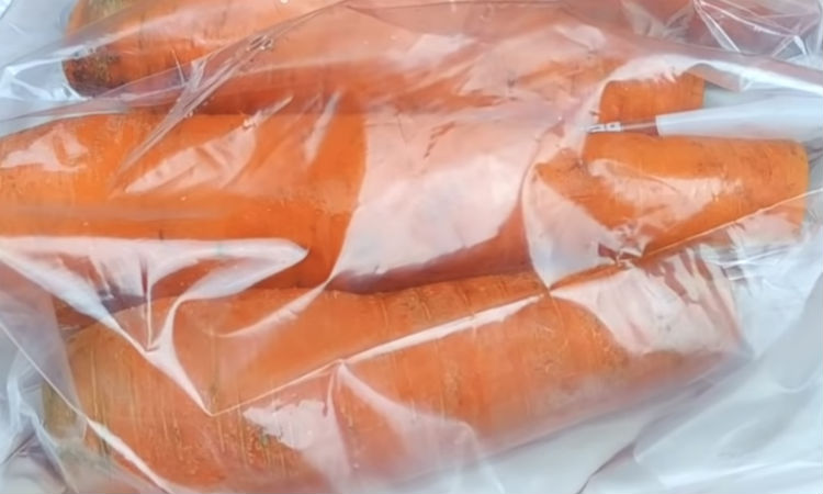 Морковь и вода, больше ничего нам и не потребуется. Морковь моем, отрезаем с обеих сторон хвостики и выкладываем в пакет для зажарки.