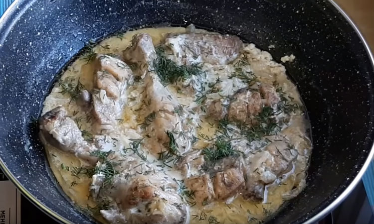 Пересыпаем в масло лук и его обжариваем уже на среднем огне. Вливаем в сковородку воду и добавляем 200 граммов сметаны. Хорошенько перемешаем и ждем, пока закипит. Добавляем в смесь курицу.