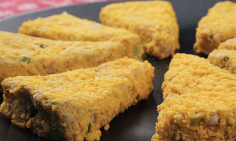 Следующей на стол поставим закуску «Мимоза», сделанную в форме сырных треугольников. Нам понадобится банка горбуши, отварная картошка, морковь, пара вареных яиц, сыр, зеленый лук, майонез и соевый соус.