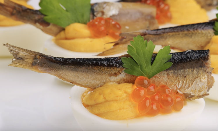 Быстрее всего будет сделать фаршированные яйца с икрой и шпротами. Просто отвариваем яйца, добавляем майонеза, горчицы, копченой паприки, соли и перца. Начиняем шпротами и совсем небольшим количеством красной икры для вкуса.