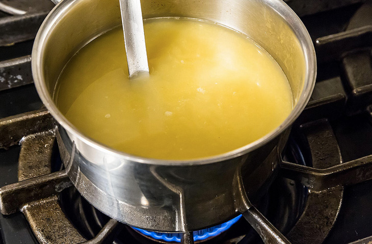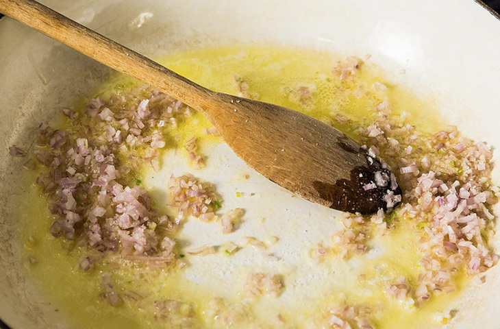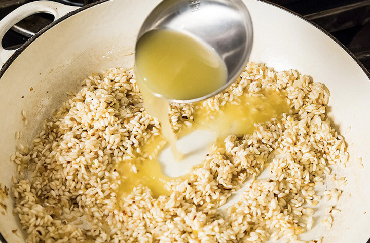 Если вы располагаете свободным временем, приготовьте овощной или куриный бульон. Он является основой блюда и задает общий вкусовой фон. Если же времени у вас нет, воспользуйтесь бульонным кубиком — ничего постыдного в его использовании нет, ведь к подобной уловке прибегают и сами итальянцы. Бульон поставьте разогреваться на плиту. На 400 гр. риса необходимо около 1,2 литра бульона.