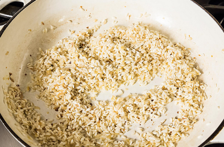 Добавьте к луку рис, увеличьте огонь и обжаривайте рис, часто помешивая. Когда он станет прозрачным и впитает масло, можно добавить вино или вермут.