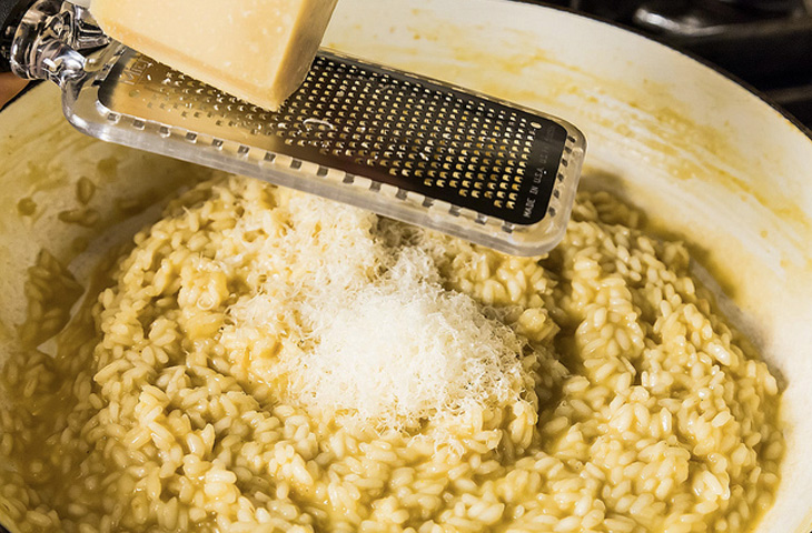 Вместо того, чтобы варить рис, можно его обжарить с маслом, а потом добавить немного бульона. В итоге получится ризотто, вкуснейшее блюдо из риса, в которое можно дополнительно положить все, что нашлось в холодильнике. Бекон, грибы, горошек – ризотто может быть разным на вкус и все эти продукты подойдут. На готовку нам понадобится всего лишь 30 минут, а результат может быть и обедом, и ужином.