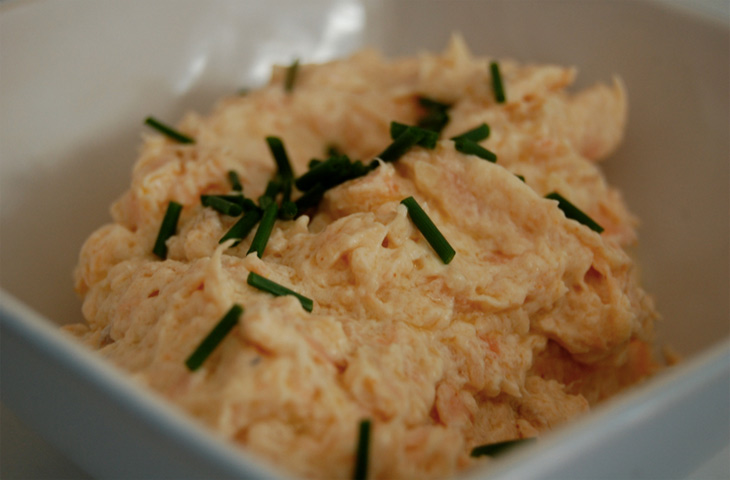 Снять с рыбы кожу. С помощью вилок или руками разделить рыбу на маленькие кусочки. Добавить зерненый творог, крем-фреш и перемешать ложкой. Если смесь кажется сухой, добавить еще ложку творога. Если необходимо, по вкусу посолить. Поперчить, добавить хрен и хорошо перемешать. Добавить лук, оставив щепотку для подачи. Аккуратно перемешать. Сверху посыпать оставшимся луком. Перед подачей паштет необходимо достать из холодильника примерно за полчаса, чтобы он дошел до комнатной температуры. Подавать с ломтиками багета или крекерами.
