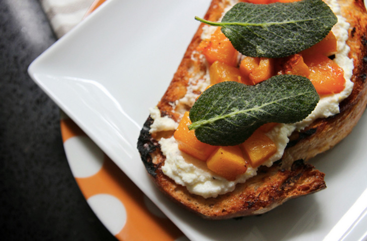 Положить ломтики багета на противень. Полить оливковым маслом и приправить солью и перцем. Выпекать в течение 3-5 минут. Дать немного остыть. Каждый ломтик багета намазать рикоттой. Сверху выложить запеченную тыкву сквош и украсить листьями шалфея.