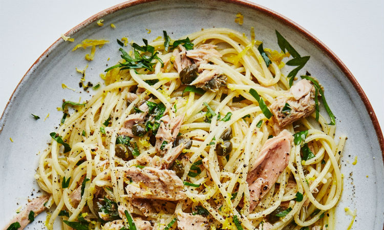 И прямо туда же на сковороду выкладываем пасту. Снимаем с огня, добавляем чуть рукколы и соли — и, конечно, самого тунца. Обязательно выжмите немного лимона на блюдо перед подачей.