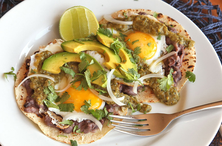 2. Перед самой подачей выложите тортильи на тарелки и намажьте их пюре из фасоли. Поджарьте яичницу, посолите, поперчите. Каждое отдельное яйцо положите на тортильи и добавьте соус сальса верде. Украсьте оставшимся луком и кинзой. Подавайте, украсив по краям ломтиками лайма и авокадо. -