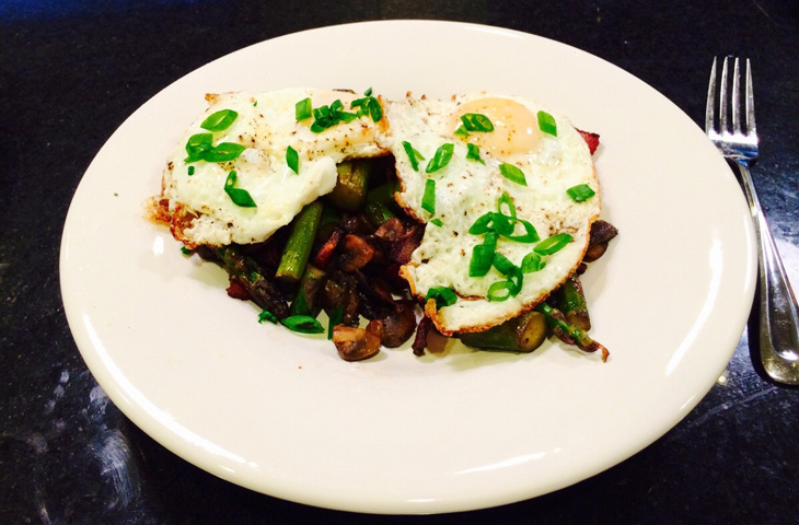 Яичница с грибами, беконом и спаржей