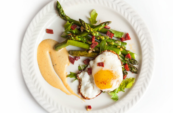 Обжаренная спаржа с чоризо, глазуньей и соусом алиоли