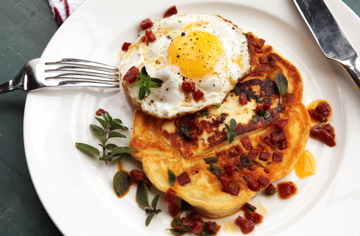 Глазунья с блинчиками из чоризо и сыром халуми