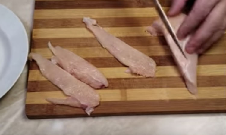 На филе одной курицы потребуется 4 яица, чайная ложка специй к мясу, соль и перец по вкусу, 2 столовых ложки кукурузного крахмала и растительное масло. Промытое и высушенное куриное филе нарезаем на относительно тонкие полоски.