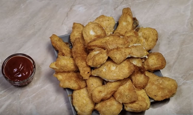 К белкам добавляем соли и блендером взбиваем их до белой пены. Приступаем к самой жарке: обмакиваем каждую полоску в белки и обжариваем с каждой стороны по 2-3 минуты.