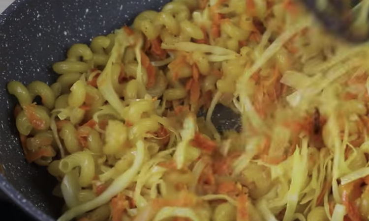 Следом отправляем на сковороду капусту, накрываем крышкой и тушим постоянно помешивая. Минуты через пять на среднем огне можно добавить макароны из твердых сортов.