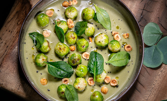 На тарелку перелить соус, сверху выложить капусту, украсить фундуком и молодым шпинатом.