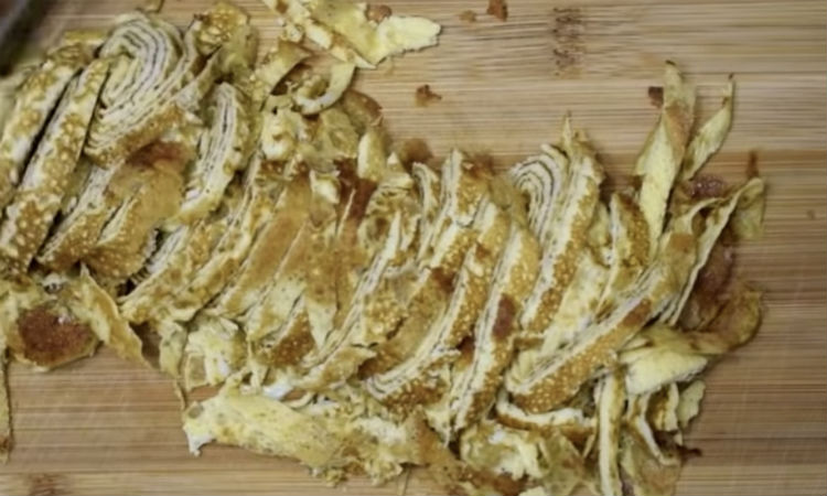 В отдельную посуду разбиваем яйца, взбалтываем и на заранее разогретой сковороде жарим тонкие омлетные блинчики. Их нужно будет нарезать соломкой и добавить к основному салату.