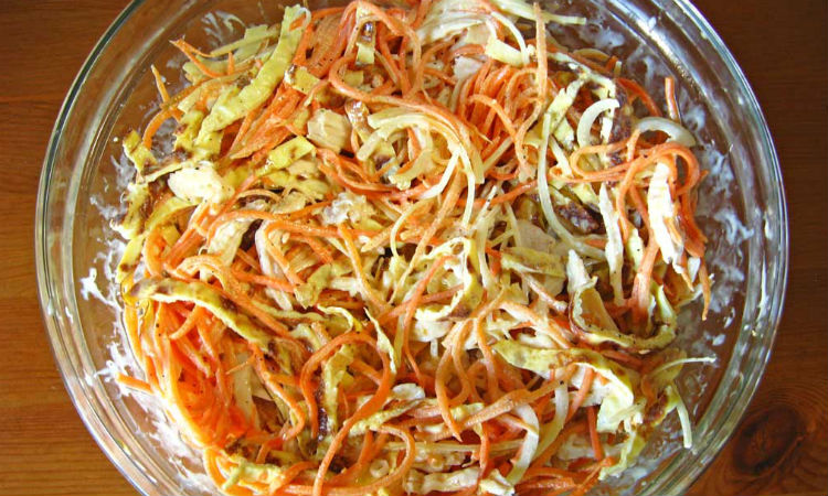 Салат по новому рецепту будет идеальным гарниром к почти любому обеду. Жарим омлет как блинчики, нарезаем и добавляем в капусту. Набор продуктов для салата действительно прост.