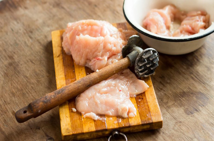 Для разрушения жестких волокон на мясо оказывается механическое воздействие. Обычно для этого используется специальный молоток. Если же его нет, подойдет обычная скалка или внешняя часть дна сковороды. Перед отбиванием грудок их следует завернуть в полиэтиленовую пленку или вощеную бумагу. Отбивают мясо до тех пор, пока оно не достигнет примерно одинаковой толщины, оптимальное значение которой составляет 0,5-0,6 см. При выборе грудок стоит также обратить внимание на их размер: тем равномернее будет прожарка у всех кусков, чем более близкие значения длины и ширины будут иметь исходные продукты.