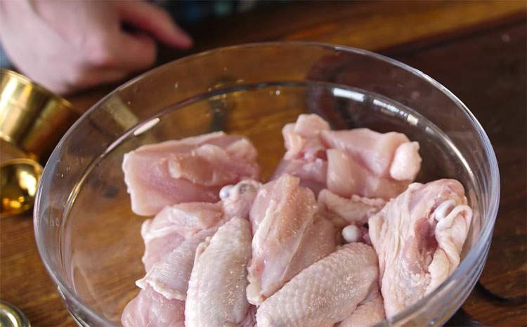 Сначала курицу разделаем на небольшие куски, удобные для жарки. Теперь немного маринуем.