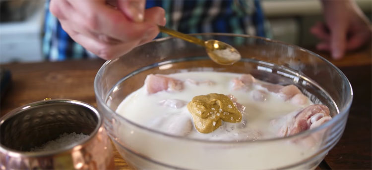 Наша основа – это смесь из стакана кефира, стакана айрана, столовой ложки горчицы и специй. Заливаем маринадом всю курицу и ждем.