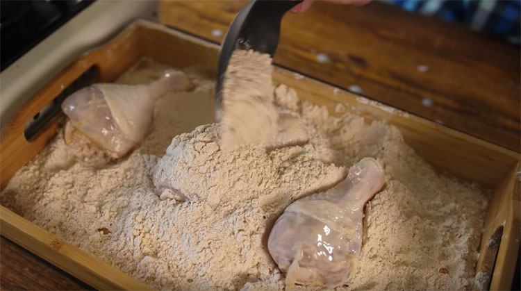 Вместо жарки курицы на сковороде в масле, ее можно пожарить в муке. Получается необычайно сочно внутри, а снаружи курица покрывается хрустящей корочкой.
