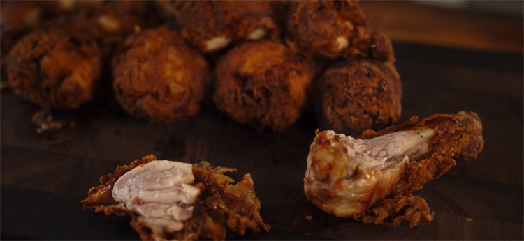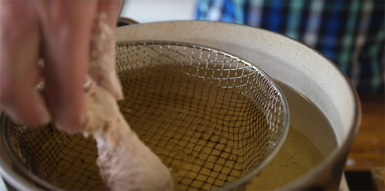 Теперь жарка – курица должна жариться или во фритюре, или в сковороде с толстым слоем масла – мясо должно быть полностью погружено в масло.
