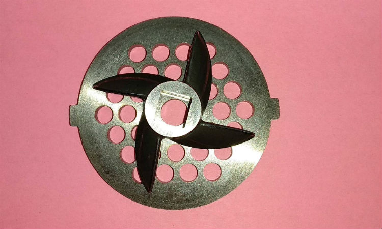 Прокручивать мясо становится труднее потому, что стачиваются не только поверхности ножа, но и решетка, через которую выходит готовый уже фарш. Между ними образуется зазор, что и мешает нормальной работе. Поэтому обрабатывать будем и сам нож и решетку.