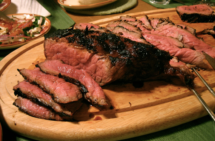 Температура же внутри готовых rare-стейков колеблется от 39 до 43 °С. При разрезании хорошо поджаренной наружной поверхности наблюдается обильное выделение соков с кровью.