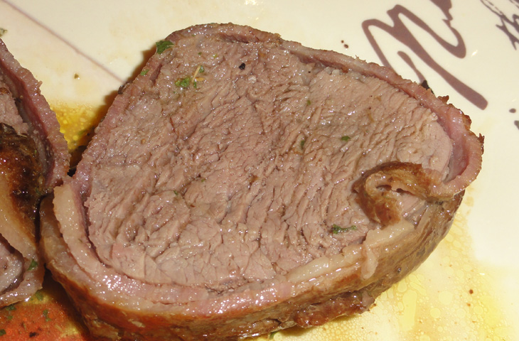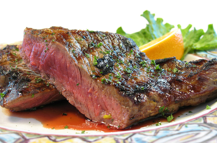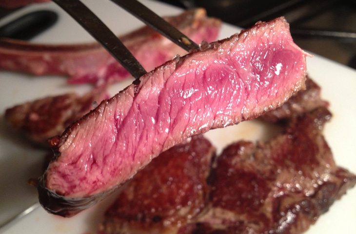 Не меньше сока выделяется и в прожаренном до состояния medium rare куске мяса, но при этом его кроваво-красный цвет сменяется бледно-розовым. Температура внутри мяса составляет 42-47° С.