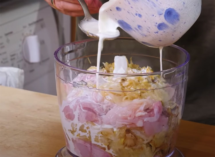 4. Половину обжаренных овощей с грибами и капустой переложите в куттер вместе с подготовленными куриными бедрами. Добавьте три столовые ложки сливок. Измельчайте до однородной массы, чтобы котлеты были нежными и хорошо держали форму. Важно не перегружать куттер, чтобы масса не стала слишком жидкой.
