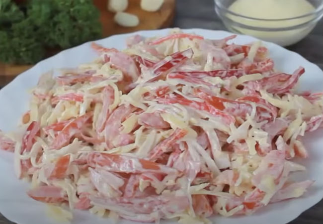 Сочный и нежный салат Красное море знают немногие и совершенно зря. Рецепт салата проще не бывает: не нужно ничего пропитывать соусом, или варить. Основной вкус блюду дадут крабовые палочки, а все остальные ингредиенты можно варьировать на свое усмотрение. За свет своей сочности и простосты он моментально вытестяет Оливье со стола.