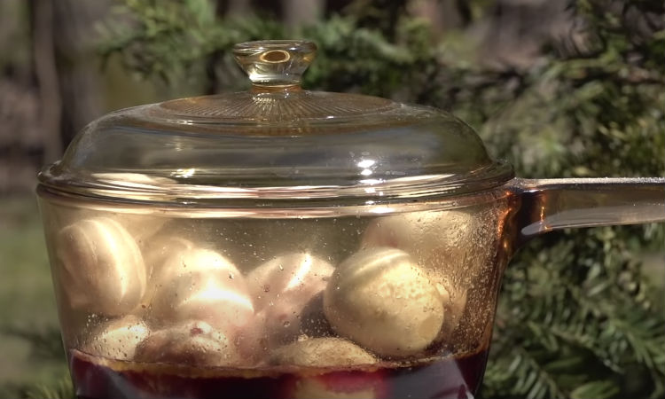 Начнем с грибов. 70 граммов масла растапливаем в сотейнике и отправляем в него шампиньоны, ножки нужно предварительно срезать. Добавляем свежемолотого перца, наливаем в сотейник 50-70 миллилитров сухого красного вина и оставляем томиться под крышкой.