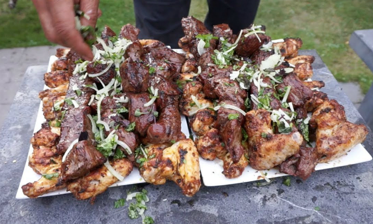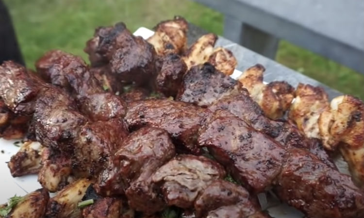 Секрет вкуса такого шашлыка не только в соусе, но и в общей подаче. Салат из запеченных овощей и мясо — осталось добавить разве что немного тонкого армянского лаваша.
