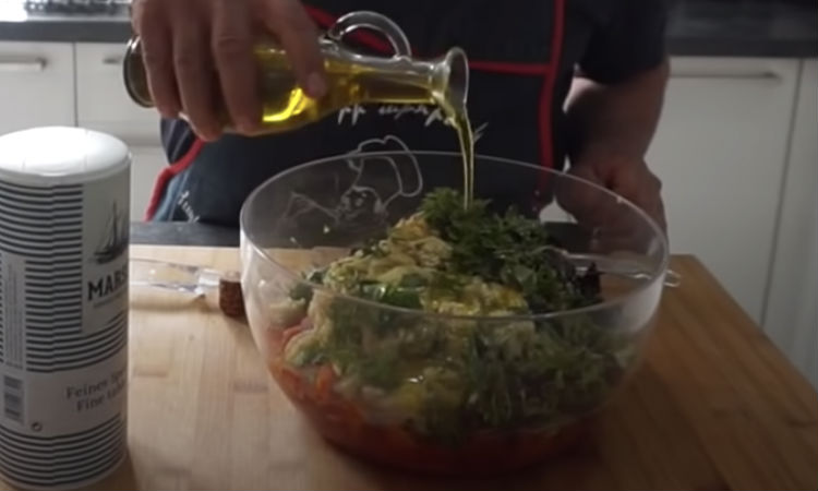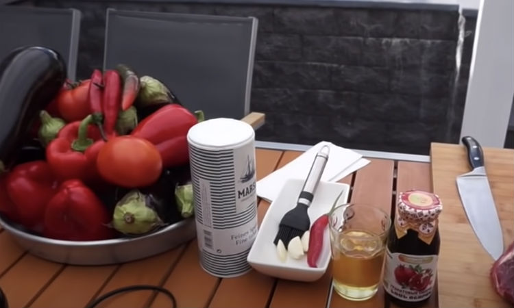 Пока шашлык «отдыхает» есть время пожарить на углях овощи. Баклажан, болгарский красный перец и помидоры, этих овощей будет достаточно. Снимаем с готовых уже баклажанов кожуру, перекладываем в глубокую миску. Туда же режем свежий огурец, поджаренные помидоры и болгарский перец. Не помешает и зелень — нашинкуйте к овощам базилика и укропа. Заливаем салат 100-120 миллилитрами оливкового масла, перемешиваем и солим по вкусу.