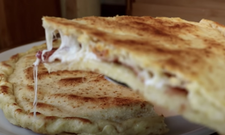 Ингредиенты для пирога просты: тесто делаем из 250 граммов муки, 3 столовых ложек оливкового масла, столовой ложки разрыхлителя, 130 миллилитров воды. Для начинки возьмем немного фарша, 100 граммов сыра и несколько ломтиков ветчины. В принципе, начинку можно сделать любой — даже если убрать фарш и оставить только ветчину, будет вкусно.