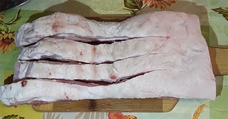 1. Промойте грудинку под холодной водой и обсушите бумажным полотенцем. Разрежьте мясо вдоль на полоски шириной около 2,5–3 см. Не дорезайте до конца — оставьте 2–3 см с одного края, чтобы куски оставались соединёнными. Разверните получившиеся полоски, как книгу. Аккуратно отбейте каждую полоску кухонным молоточком. Достаточно по 1 минуте с каждой стороны, чтобы мясо стало мягким, но не рвалось. Для удобства можно накрыть мясо пищевой плёнкой, чтобы не разбрызгивался сок.