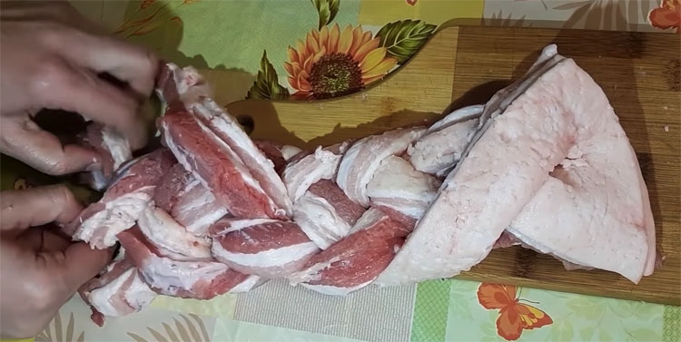 2. Когда все полоски отбиты, переплетите их между собой, как косу или верёвку. Это не только красиво, но и помогает сохранить сочность. Низ переплетённой грудинки аккуратно перевяжите кулинарной ниткой, чтобы конструкция не развалилась во время запекания.