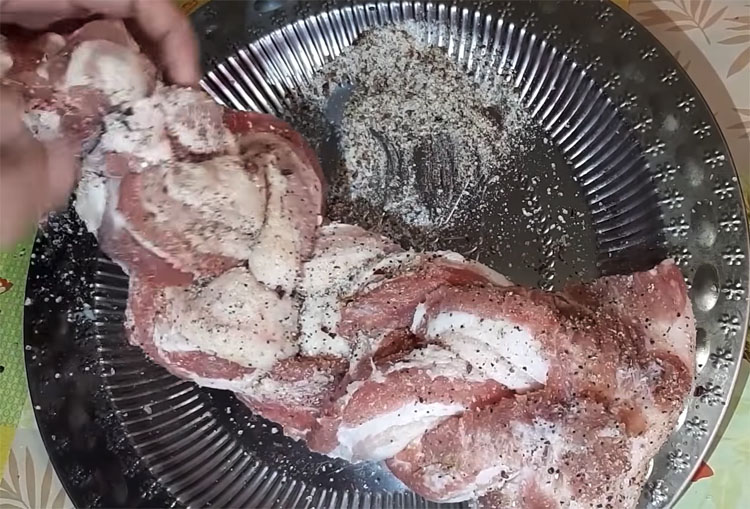 3. Щедро посолите мясо со всех сторон. Обсыпьте смесью перцев — можно использовать готовую приправу для мяса или смесь из свежемолотого чёрного, душистого и немного красного перца. Если есть желание, можно также добавить щепотку сушёного чеснока или паприки.