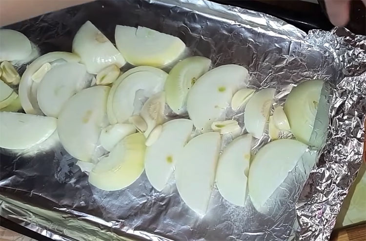 4. Нарежьте лук крупными кольцами или полукольцами. Чеснок можно просто раздавить плоской стороной ножа или крупно нарезать. На лист фольги, сложенной вдвое (по размеру противня), выложите слой лука и чеснока. Это станет ароматной подушкой, которая придаст мясу дополнительный вкус и не даст ему пригореть.