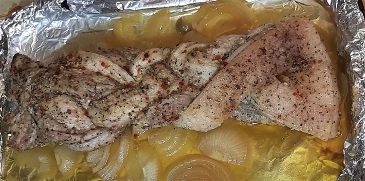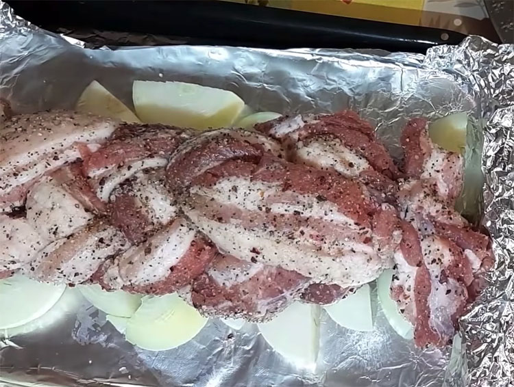 5. Сверху на лук и чеснок выложите подготовленную переплетённую грудинку. Накройте вторым листом фольги, плотно загните края, чтобы внутри образовался герметичный "конверт". Это сохранит соки и обеспечит равномерное пропаривание.