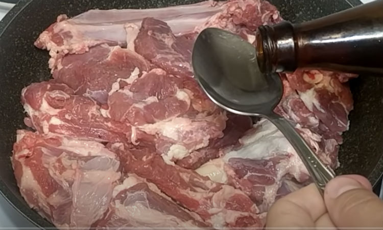 Режем мясо крупными кусками и кладем на разогретую сковороду. Сразу наливаем две столовые ложки уксуса, распределяя его по всему мясу.