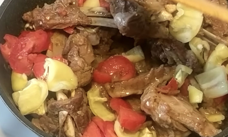Затем наливаем в сковороду 120 миллилитров воды и тушим еще 25 минут, жидкость должна полностью испариться. Пора добавить на сковороду помидоры и болгарский перец. Следом кладем картофель, снова наливаем воду и тушим 8 минут до полной готовности.